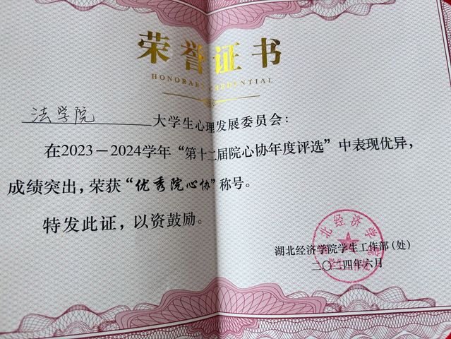 本网讯(通讯员:胡雪梅)买球官网大学生心理发展委员会在2023-2024学年“第十二届院心协年度评选”中表现优异,荣获“优秀院心协”称号。