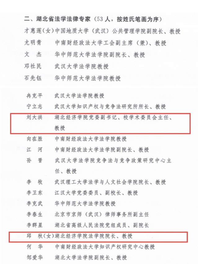 近日,湖北省首批法学法律人才库入库人员公布:我院共有五名教师入选,刘大洪、邱秋入选湖北省法学法律专家,范锐敏、段宏磊、嵇雷入选湖北省青年法学法律人才。