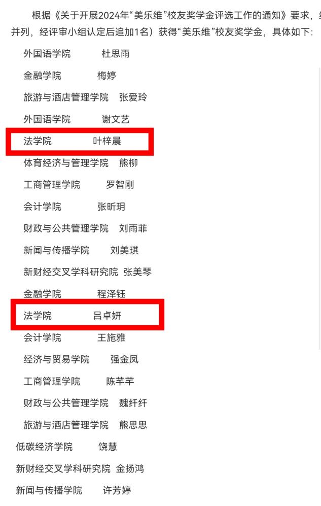本网讯(通讯员:李祎)为表彰在学术、领导力和个人成长等方面表现出色的学生,激励更多学生追求卓越。我校学生工作处于2024年11月28日公布了“美乐维”校友奖学金、“黄冬梅励志奖学金”以及大学生“自强之星”评选结果。评选经过学院推荐、学校笔试和面试等环节,共授予45人相关荣誉。