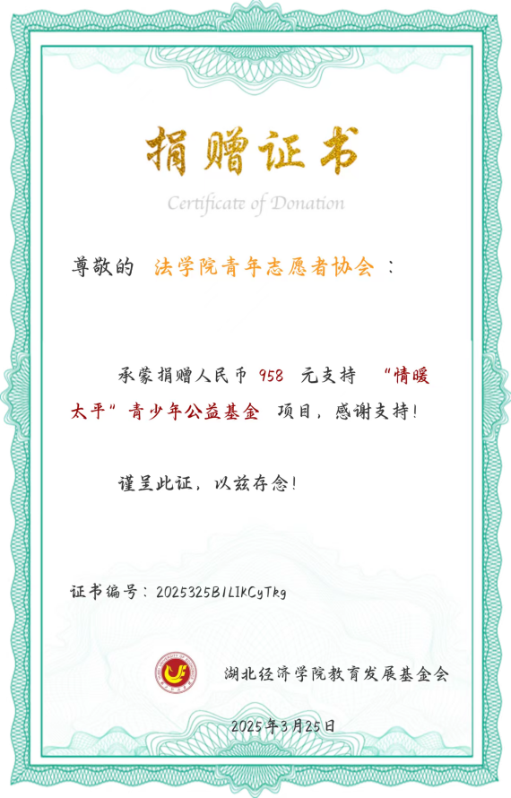 本网讯(通讯员:尹子涵,审核人:司马子鸣)3月30日,买球官网青年志愿者协会在樱花市集的“樱”为有你,“漆”望同行为主题的漆扇公益义卖活动圆满结束。活动结束后,志愿者们将义卖所得除去合理费用后的善款共计人民币1400元,分两批捐赠至“情暖太平”青少年公益基金,十大正规买球的app排行榜教育发展基金会为协会颁发了捐赠证书以兹纪念。