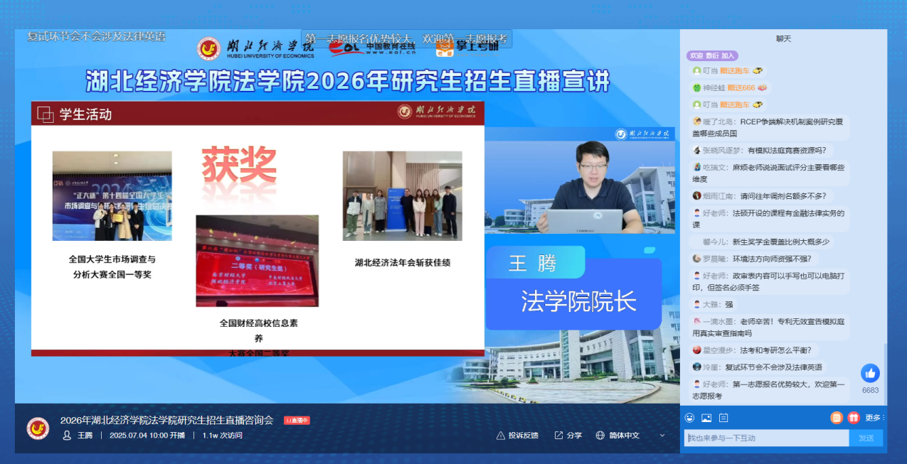 本网讯 7月4日上午,买球官网通过中国教育在线·掌上考研平台成功举办了2026年法律硕士研究生招生线上直播宣讲会,并同步在学习强国、百度、360、搜狗、今日头条等各大平台进行全面推广,实现直播信息全网覆盖,有效帮助广大考生及时获取招生宣讲信息。