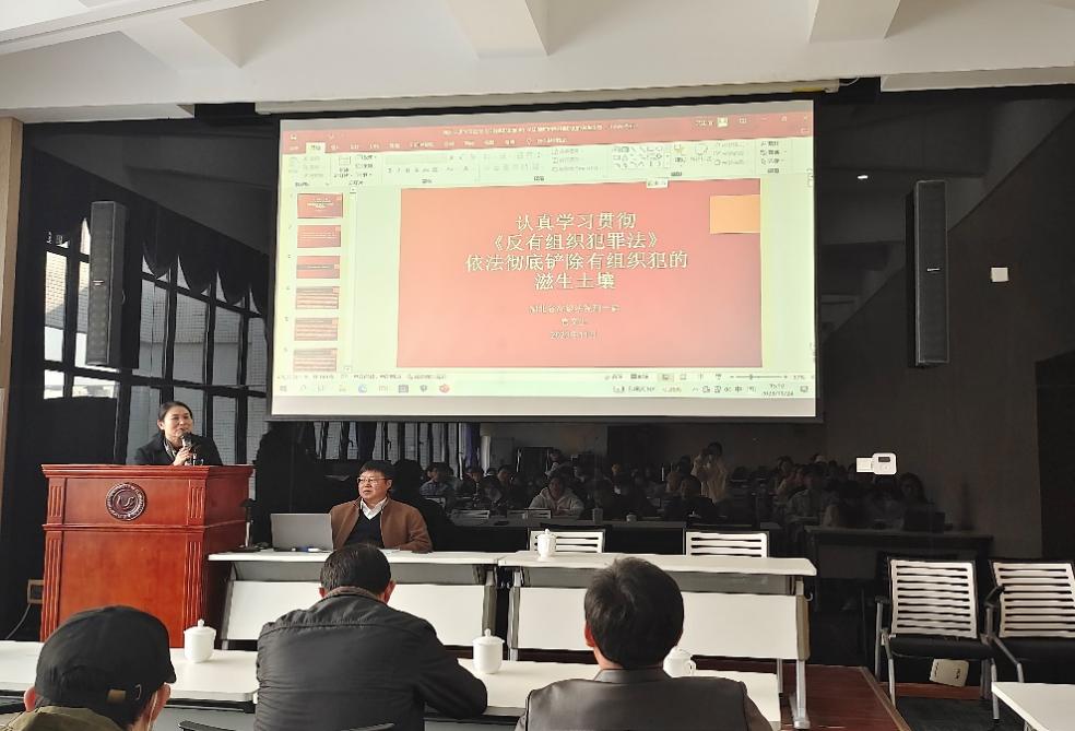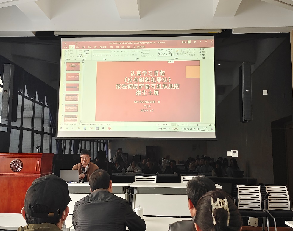 本网讯(通讯员:范琳琳)为落实法律硕士人才培养目标要求,提高法律专业研究生的法治素养,学院推行“腾龙司法名家讲坛”系列活动。11月24日下午,第一讲“买球的app排行榜前十名推荐离法院有多远——认真学习贯彻《反有组织犯罪法》”正式开讲。此次讲坛邀请湖北省高级人民法院刑事审判第一庭庭长官文生主讲,买球官网邱秋院长主持,买球的app排行榜前十名推荐部分教师,辅导员司马子鸣和2023级全体硕士研究生参加。